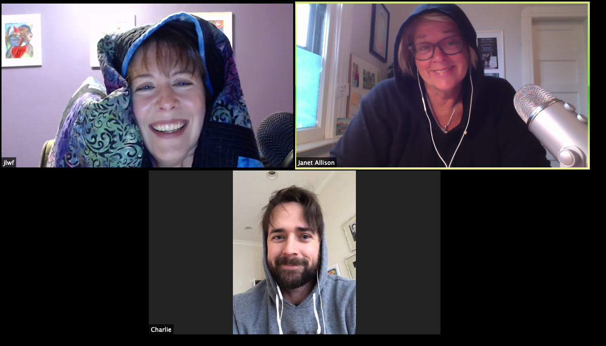 We like to snap a photo with our guests, but Charlie was reluctant; he lives in CA and his power was off due to the threat of wildfire — which meant that he hadn’t been able to shower or style his hair prior to our conversation. We reassured him & told him we’ve recorded LOTS of episodes like that! (Pictorial evidence below).